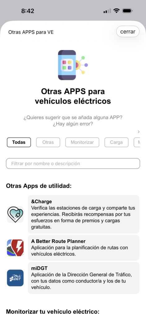 En este apartado accederás una serie de aplicaciones de interés para los usuarios de vehículos eléctricos, organizadas por categorías.